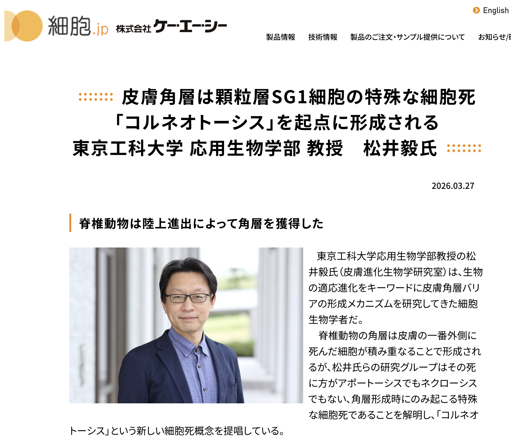 松井毅教授(化粧品コース)のインタビュー記事「皮膚角層は顆粒層SG1細胞の特殊な細胞死「コルネオトーシス」を起点に形成される」が、「研究開発の窓」(株式会社ケー・エー・シー)に掲載されました。インタビュー記事はこちら!