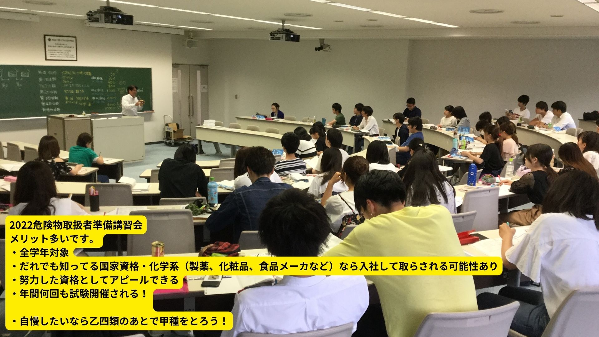 個人的に努力をして資格を取得する取り組みは、ガクチカ(学生時代に力を入れたこと)の一つといえます。学部では、危険物取扱者やバイオ技術認定試験など講習受講や受験料補助などにより資格取得を支援しています。